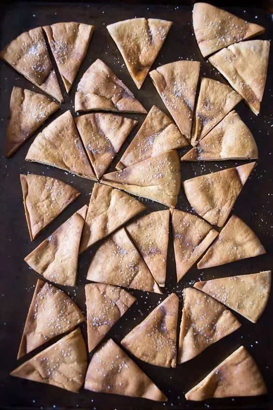 (吃剩的皮塔饼切成三角形,烤至酥脆调个味,香!)