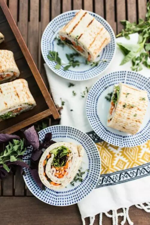 风车卷饼:鹰嘴豆泥打底,裹以羽衣甘蓝、火腿、胡萝卜