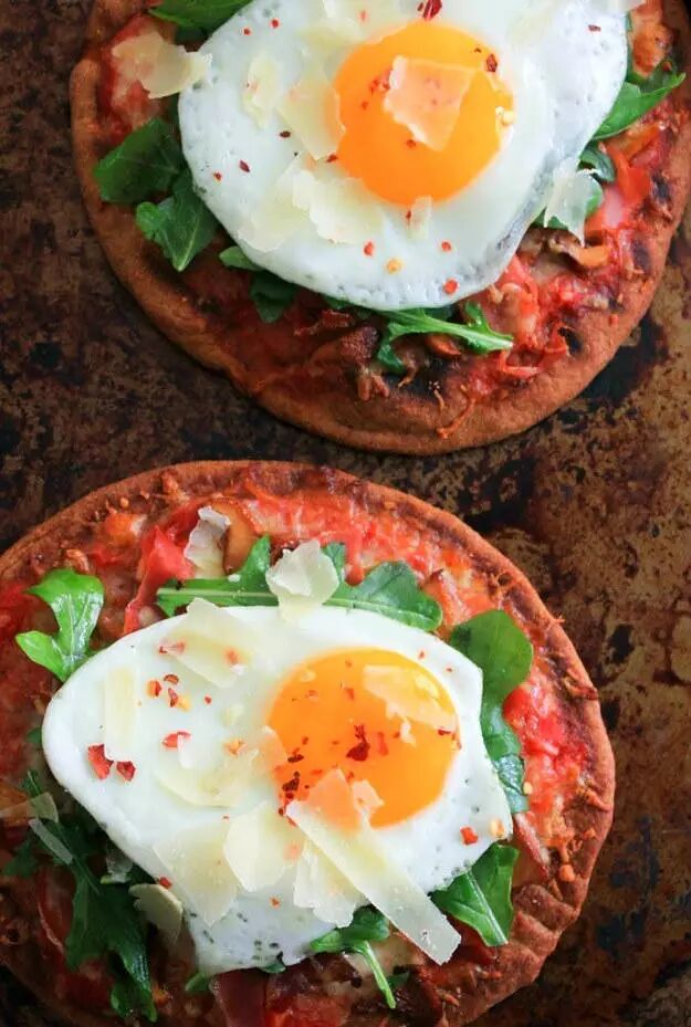 早餐披萨:荞麦皮塔饼抹手作番茄酱,打个蛋加奶酪,烤定型即可