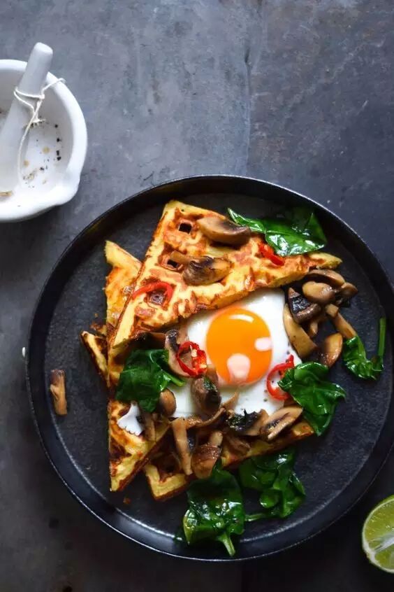 外酥内软的比利时华夫饼,也是极百搭的一种brunch元素。传统的吃法是抹上果酱、酸奶油,或淋上枫糖、蜂蜜,再搭配新鲜的水果。现在还有人开发出咸口的华夫饼:奶酪、菠菜、培根都可以融合进面糊中,吃起来像是中式的蛋饼,但奶香会更重;或者用原味无糖的华夫饼,搭配嫩煎过的蘑菇、蔬菜、鸡蛋,也是丰盛又营养的选择。