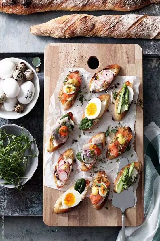 法棍是法国人雷打不动的主食,法式brunch自然也要以此为基础,做各种各样的变化。最受欢迎的吃法,是用香酥的法棍盛放不同的食材,做成精致的开放式三明治,比tapas的牙签串步骤更少,非常符合法国人慵懒的个性。