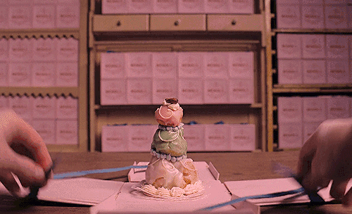 如果能把布达佩斯大饭店比作一种蛋糕,那绝对是覆盆子派。松软的派底,玫瑰色的慕斯上铺了满满一层新鲜的覆盆子。是你路过甜品店的橱窗,绝对会回望一眼的尤物。