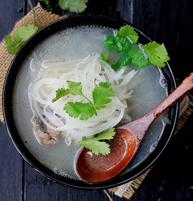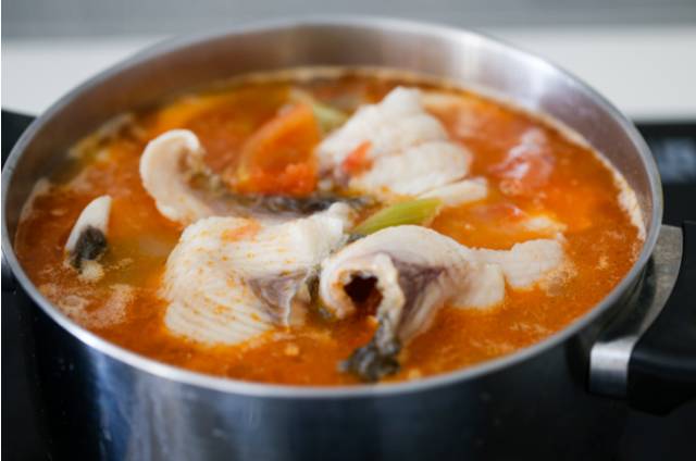 5.热水煮腌好的鱼片,煮约30秒,直到鱼肉变白,把鱼片倒入汤中