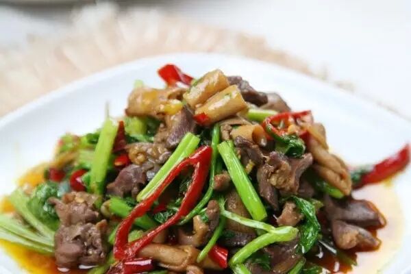 食材:鸡杂、香芹、泡椒、泡姜、蒜、生抽、料酒、淀粉、糖、郫县豆瓣酱