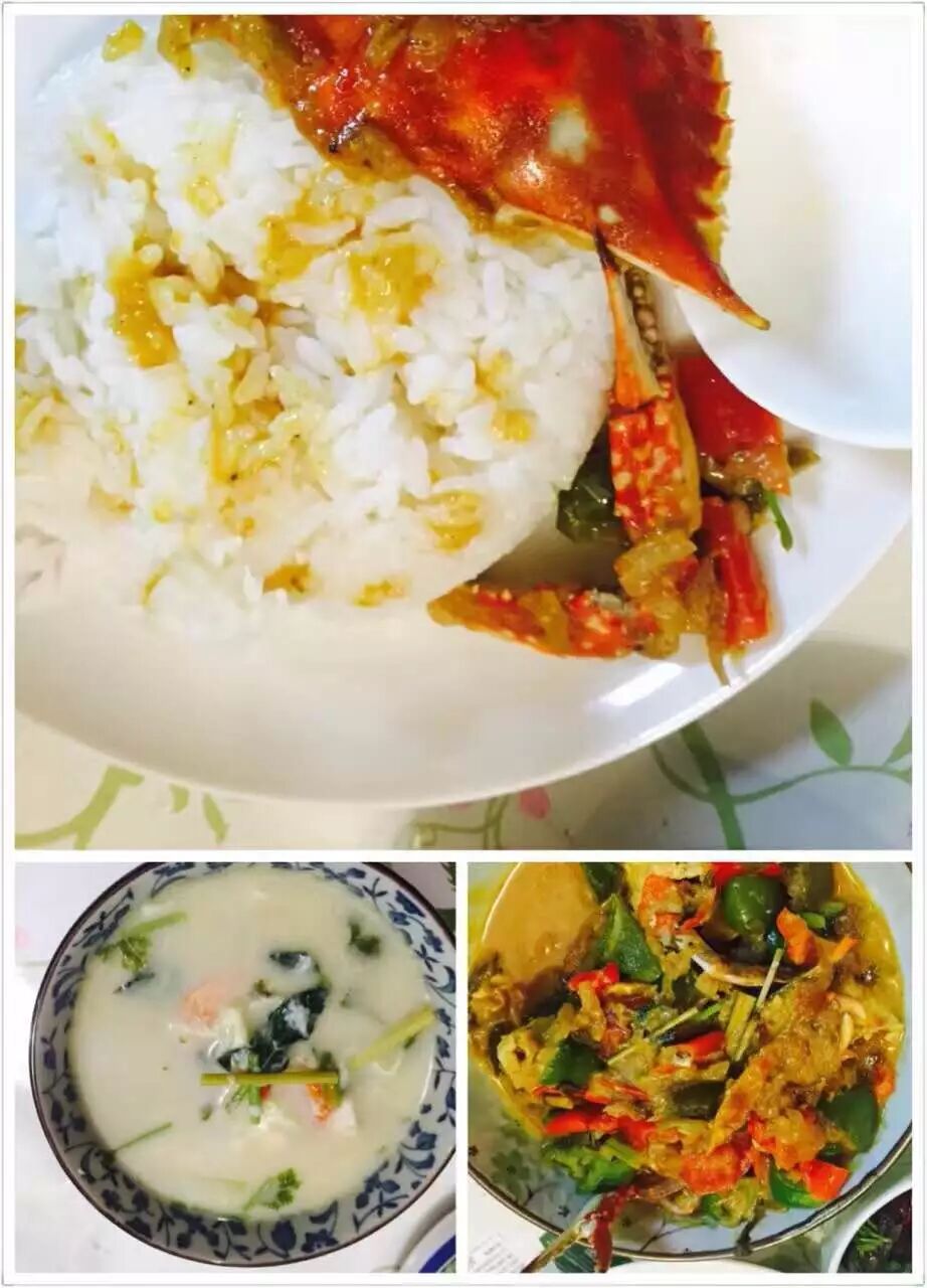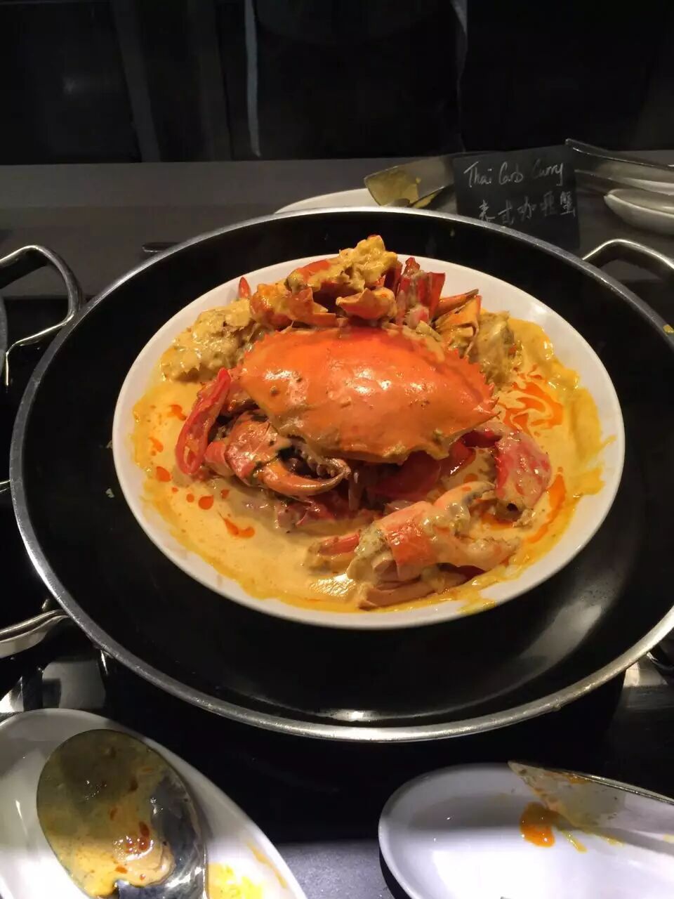 “关键要有泰式咖喱酱和椰浆,鱼露、香茅、罗勒叶,蔬菜的话加一两个灯椒,螃蟹要活杀,切块浇洒高度酒或威士忌后蘸鸡蛋液,黄油入锅炸一下蟹块,之后就是椰浆与咖喱酱,化开咖喱酱后香茅、鱼露灯椒块入,最后是罗勒叶”