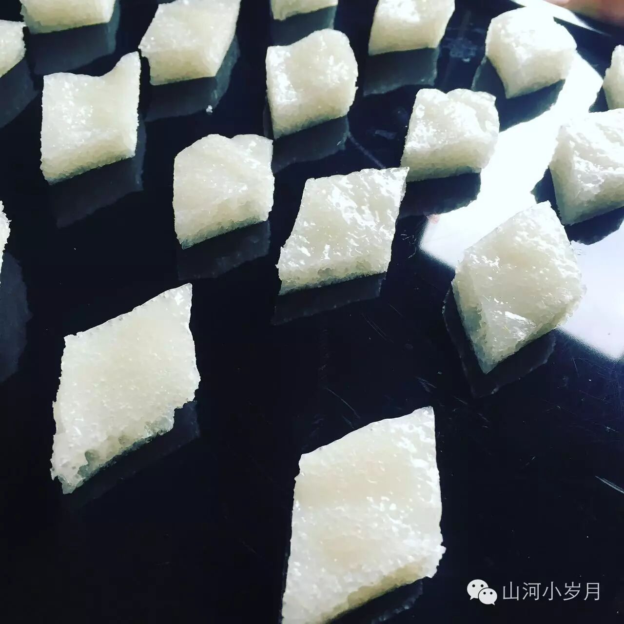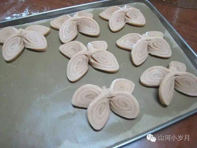 “崩砂”这款点心特别有趣,吃起来嘎嘣响,差点把我的牙齿磕掉,却有一种古朴的美味,像从前的粗点心,又像是外婆的茶食罐里才有的东西,很容易上瘾,吃个不停。我以为是因为质地而得名,后来听了李碧华的解释,才知道人家明明是“蝴蝶”。崩砂是蝴蝶形的小吃,英文名为 butterfly,大家为了简便,念成了“butter”,久而久之,才有了这个名字。啊,原来是一只脸皮厚的蝴蝶!放一张半成品给你们感受一下: