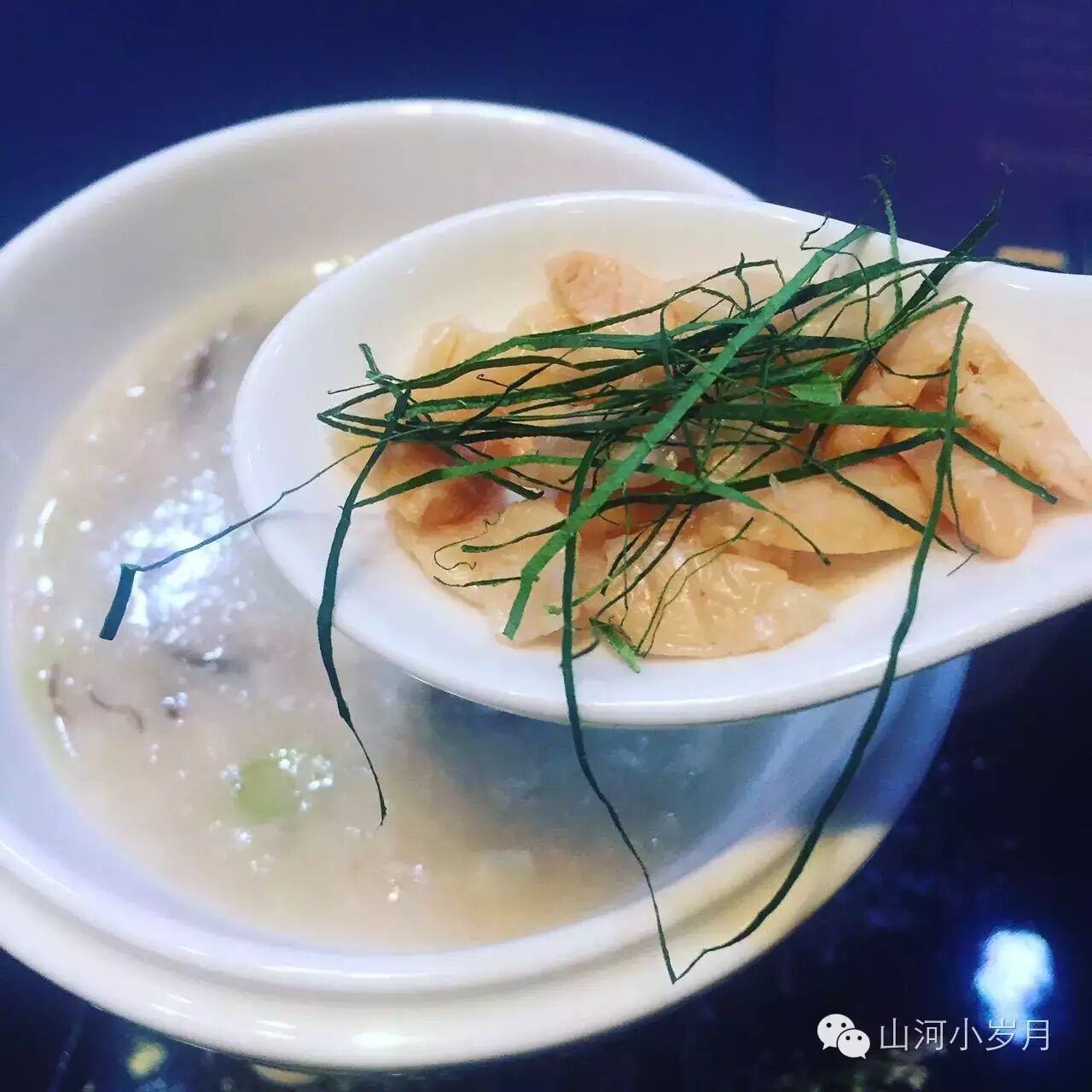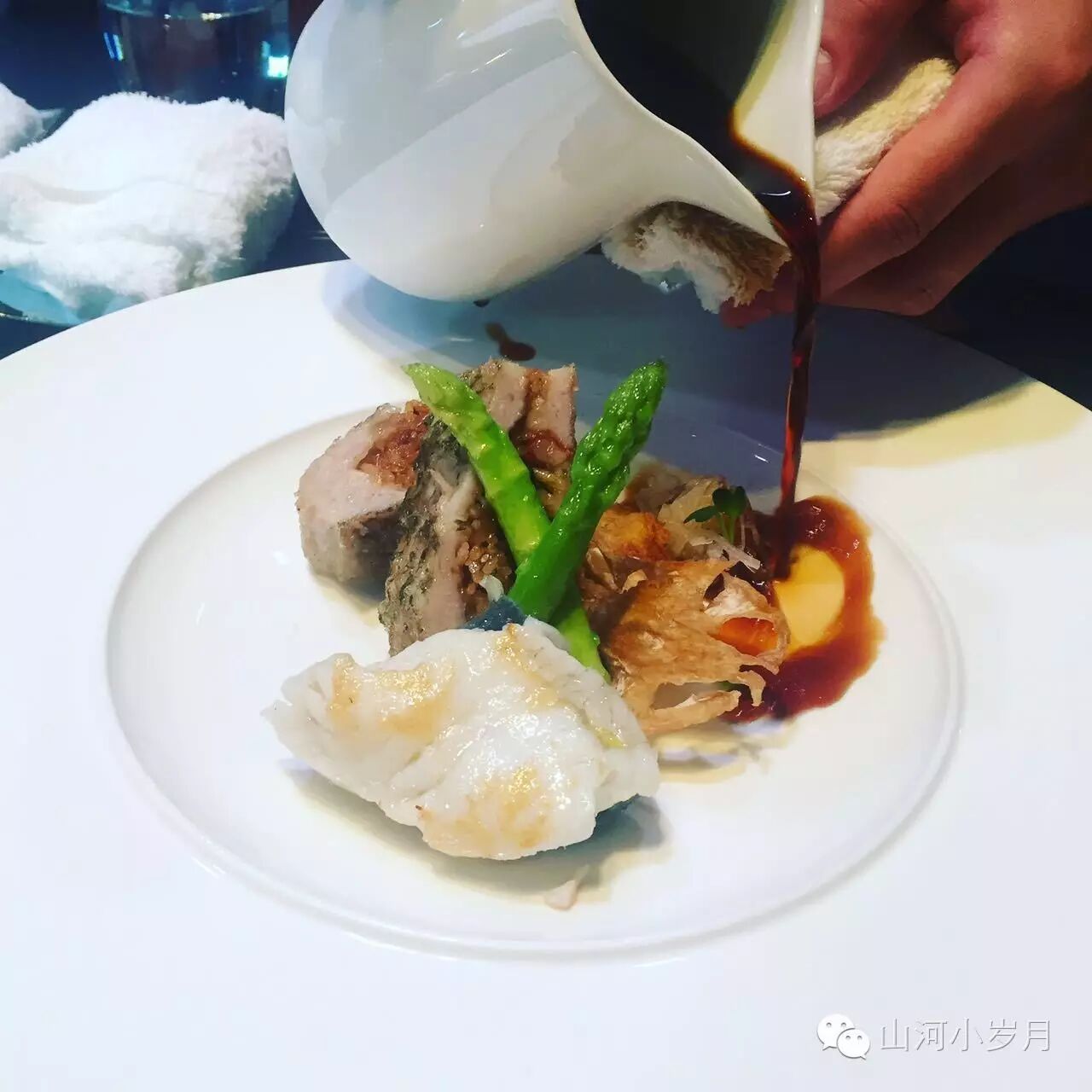 顺德人处理鱼的本领,绝对是全世界第一,所以“头菜”吃顺德鱼羹,也是理所应当。大山楂丸的药力高效,这时,我居然已经无耻地又饿了!既然是“重新发现中国味”,大厨当然要玩点新花样,以区别于传统的顺德鱼羹。这道菜用小黄鱼代替了传统的鳙鱼肉,并加入了蟹肉提鲜。但最让我击节的还是临上桌时加的那味炸榄仁和柠檬叶,因为搭配的酒是轩尼诗V.S.O.P,所以入口时,味觉很有层次感。
