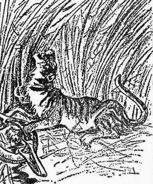 “在你的树林里有什么野兽?”“牡鹿、小鹿、野猪、狐狸、狼、大野猫和野兔!”“没有老虎么?”“没有,我们很久不见老虎了。”
