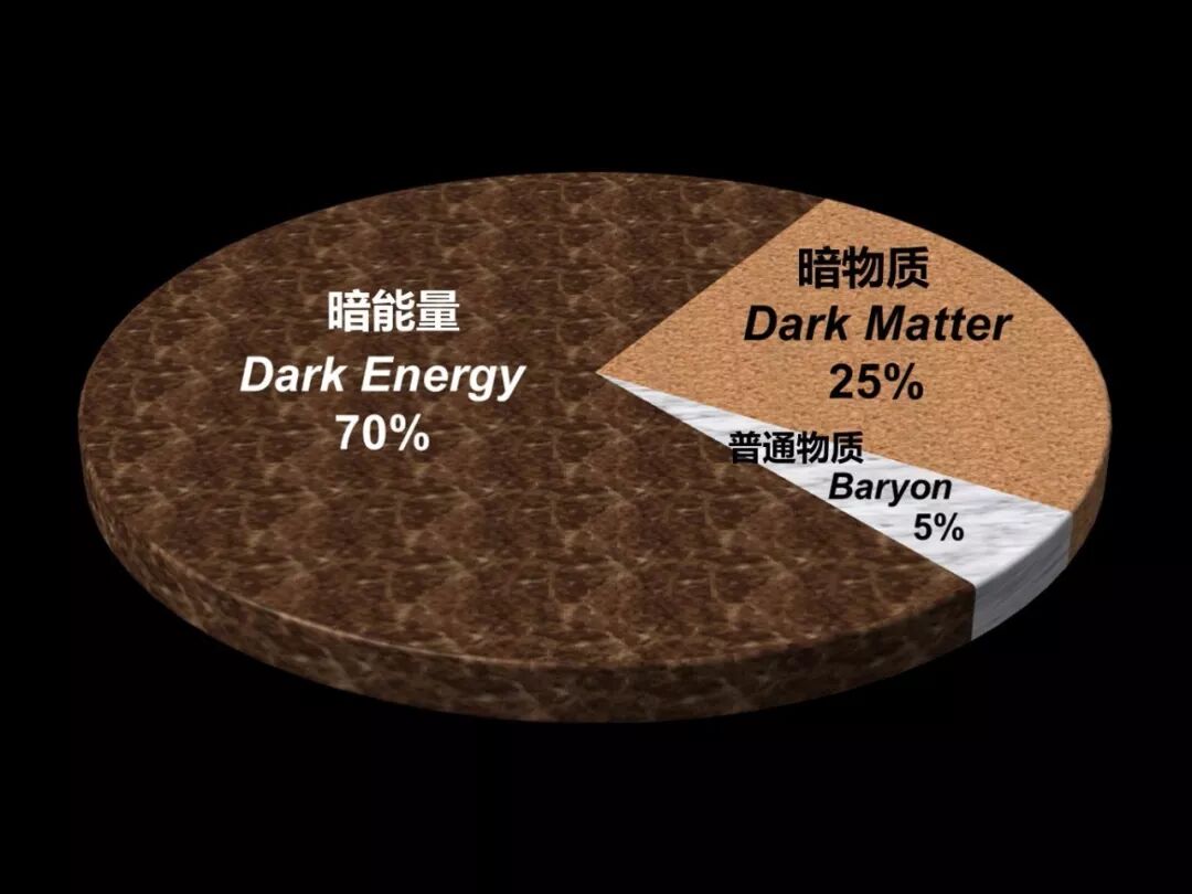 这个发现在1998年就被评为十大科学进展之首,并在2011年获得了诺贝尔物理奖。宇宙为什么加速膨胀?背后的物理原因我们今天还是不能确定的。   广义来讲,宇宙的加速膨胀是由暗能量引起的。今天宇宙的组成成分比例是下面这个图,各位可以看到,最重要的就是称为暗能量的成分,占有宇宙的70%。我们虽然不知道暗能量的本质是什么,但是我们今天已经了解了它的某些性质。