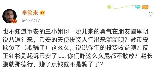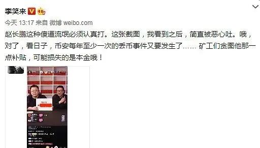 实际上,赵长鹏和何一一直在被不断的打脸,李笑来毫不客气在微博上公开称赵长鹏是骗子。