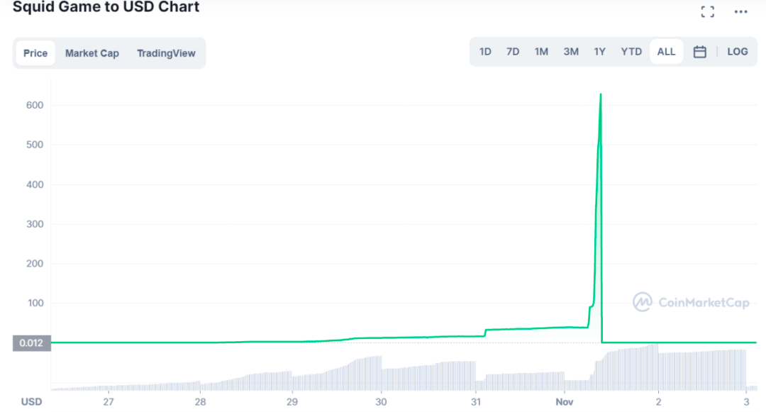 然而就在11月1日,鱿鱼币在5分钟时间内从2861美元跌到了0.0007美元,跌幅超过99.9999%。导致至少4万人爆仓,背后黑手卷款338万美元跑路。