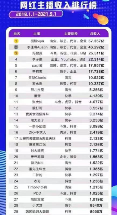 网传一份榜单显示,薇娅从2019年1月1日到2021年9月1日的收入超过57亿,是所缴纳罚金的4.4倍,相当于普通人干16万年,突破了很多人想象的极限。